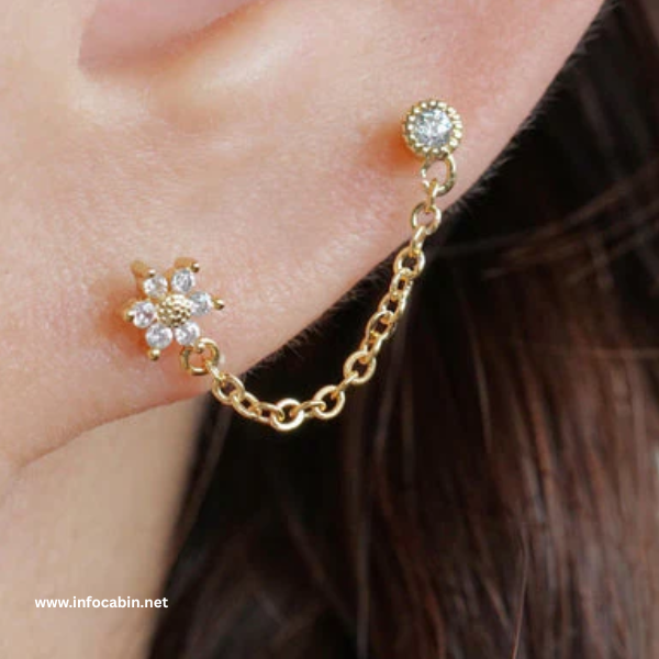 Chain earrings are trendy and bold, connecting two piercings with a delicate chain for a sleek, edgy effect. Some loop through both piercings, while others attach a stud on one end and a backing on the other.
