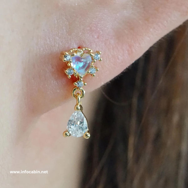 Drop earrings hang below the earlobe, adding elegance and movement. In a double lobe piercing, they’re usually paired with a smaller stud or huggie in the second hole to maintain balance and focus on the drop.